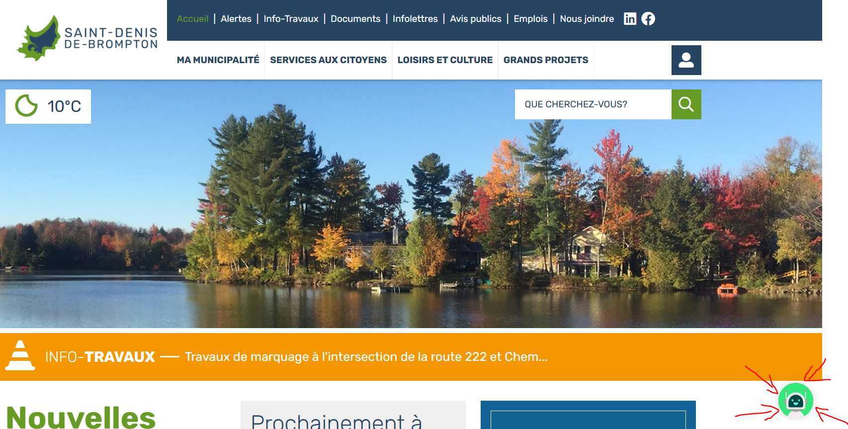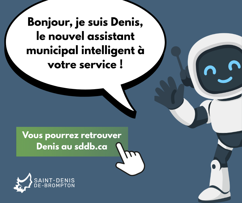La municipalité de Saint-Denis-de-Brompton tient à informer ses citoyens et citoyennes qu'elle a procédé à l'implantation d'un assistant municipal intelligent sur son site web. Cet outil, propulsé par l'intelligence artificielle, sert à faciliter la recherche d'information de nos citoyens sur tous les sujets touchant le domaine municipal.