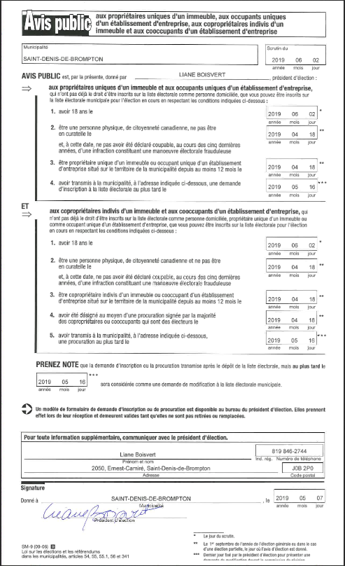 Avis public est donné par la secrétaire-trésorière de la municipalité aux propriétaires uniques d'un immeuble, aux occupants uniques d'un établissement d'entreprise, aux copropriétaires indivis d'un immeuble et aux cooccupants d'un établissement d'entreprise qui n'ont pas déjà le droit d'être inscrits sur la liste électorale comme personne domiciliée de pouvoir être inscrits sur ladite liste selon certaines conditions.