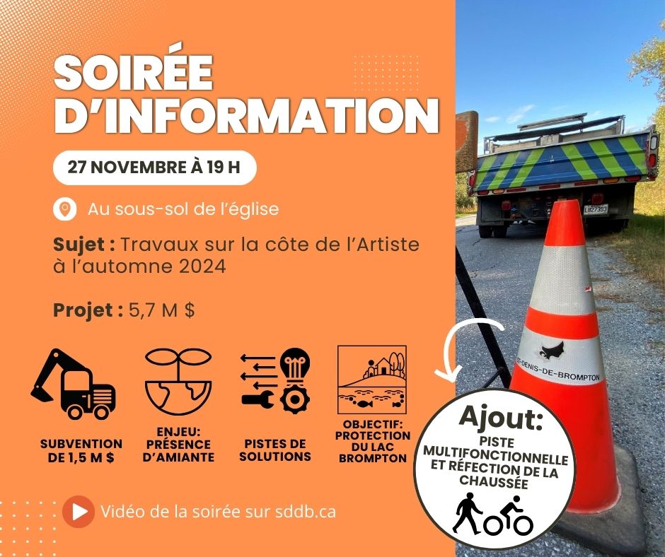 La Municipalité invite les propriétaires du secteur concerné à assister à une rencontre d'information à propos des travaux prévus en 2024 sur la Côte de l'Artiste. Celle-ci aura lieu le 27 novembre à 19 h, au sous-sol de l'église.