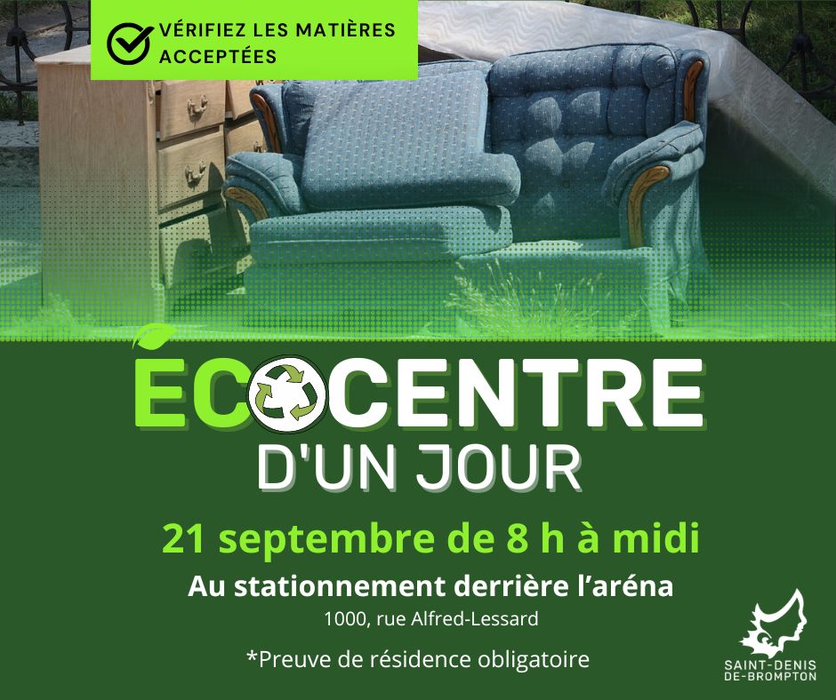 L'événement semestriel "Écocentre d'un jour" est de retour le samedi 21 septembre, derrière l'aréna, de 8 h à midi (1000, rue Alfred-Lessard).