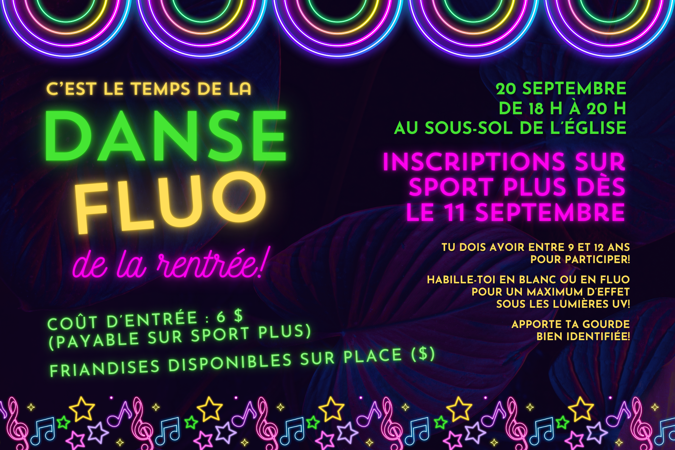 Un classique de la rentrée qui s'adresse aux enfant de 9 à 12 ans qui pourront s'amuser et danser sous la lumière UV ! Pour maximiser l'effet de la lumière UV, il est recommandé de porter un habillement blanc ou fluo ! Des friandises seront disponibles sur place (prévoyez-vous un peu d'argent de poche). Il est recommandé d'apporter votre gourde (identifié) pour l'évènement.
