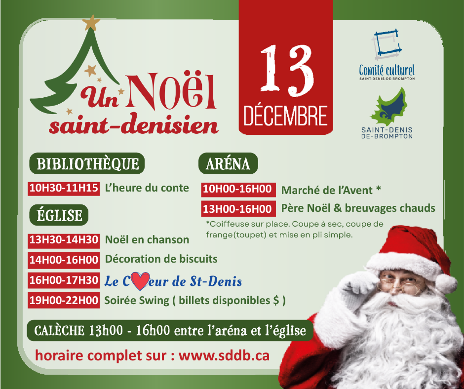 Ces activités comprend : Marché de l'Avent (et même une coiffeuse), Maquillage pour enfants, Heure du conte de Noël, Noël en chanson avec l'animation de Mathieu Mathieu (pour les enfants), Atelier de décoration de biscuits, Spectacle du Coeur de St-Denis, Tours de calèches entre l'aréna et l'église et surtout, la présence du seul et unique Père Noël !
