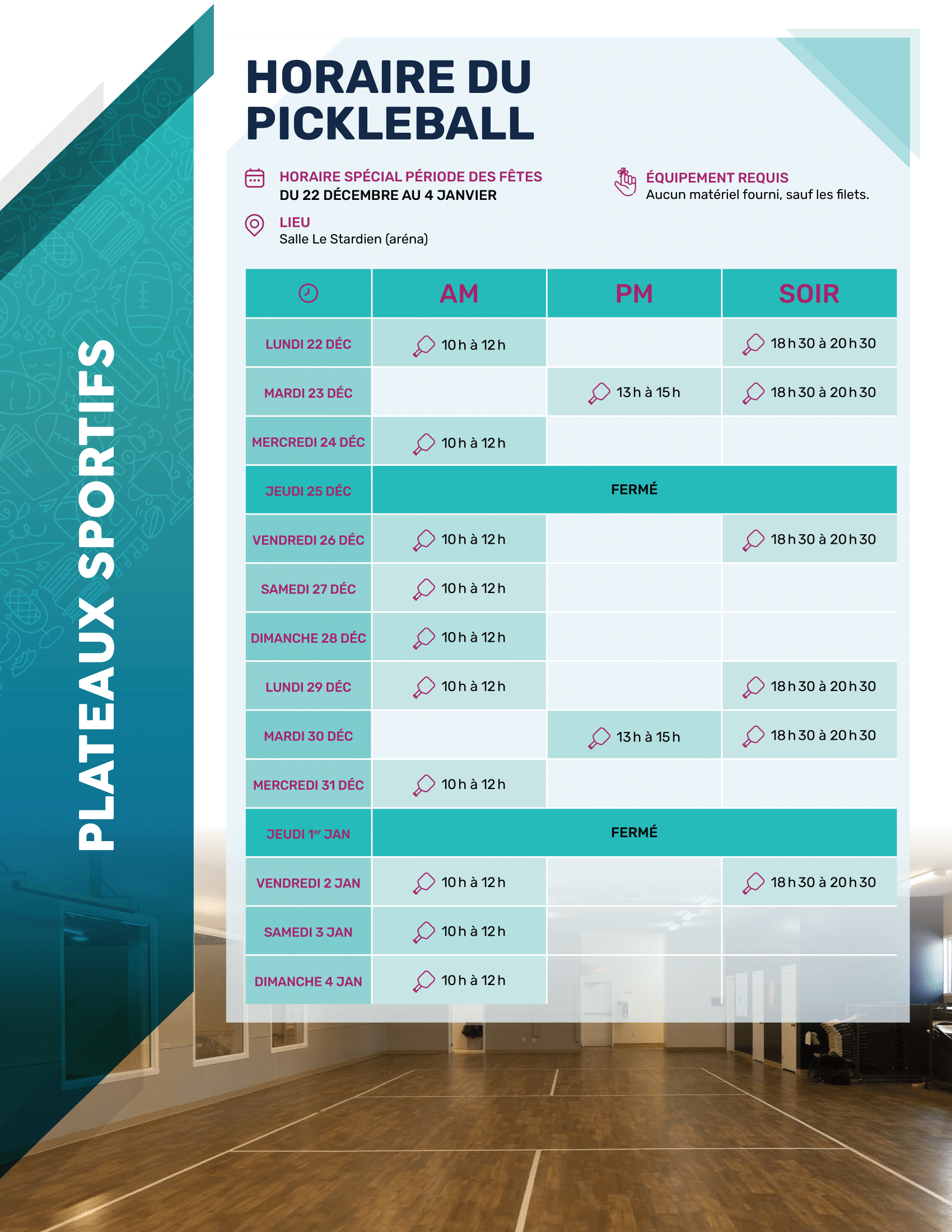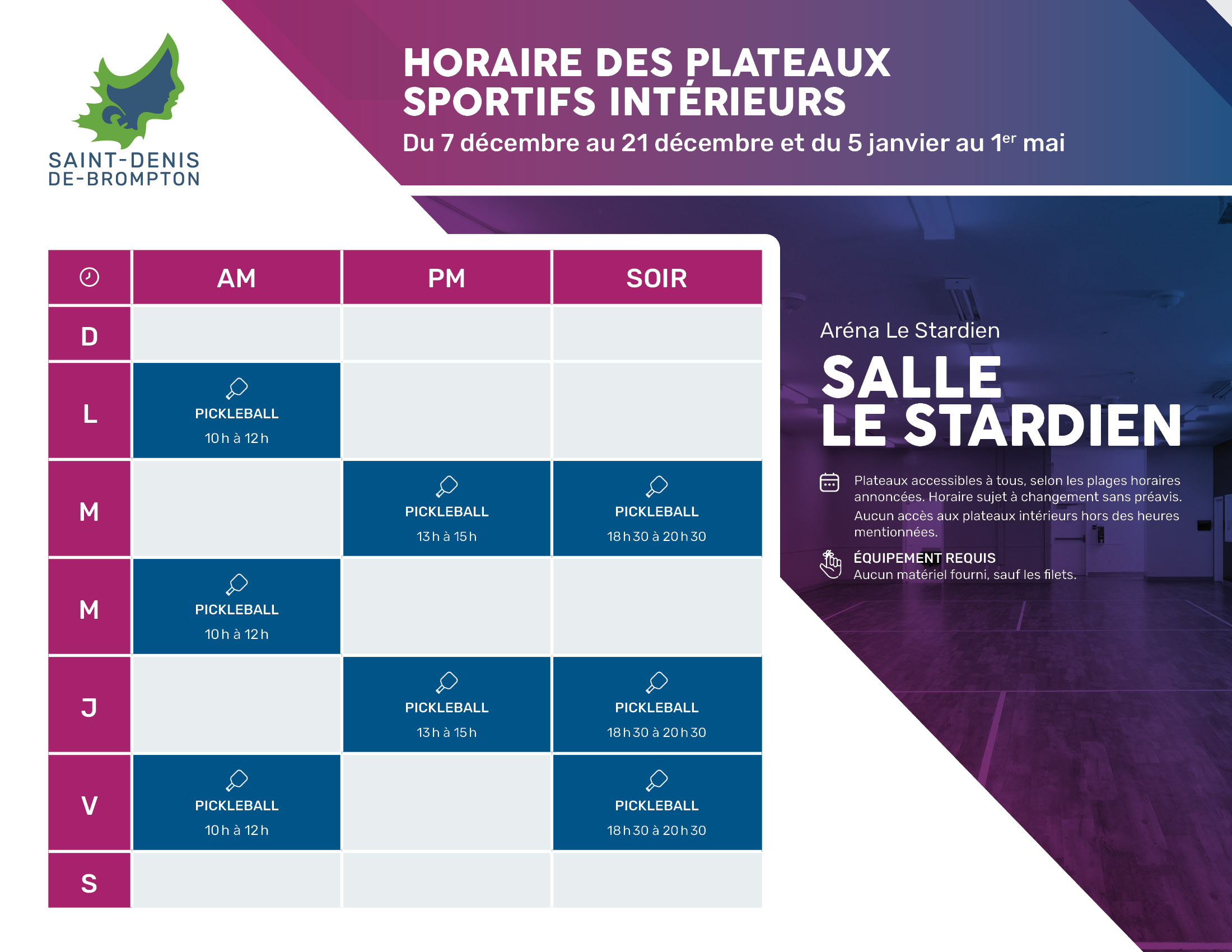 Horaire des activités libres à l'aréna le Stardien (Pickleball, Dek Hockey et basketball)