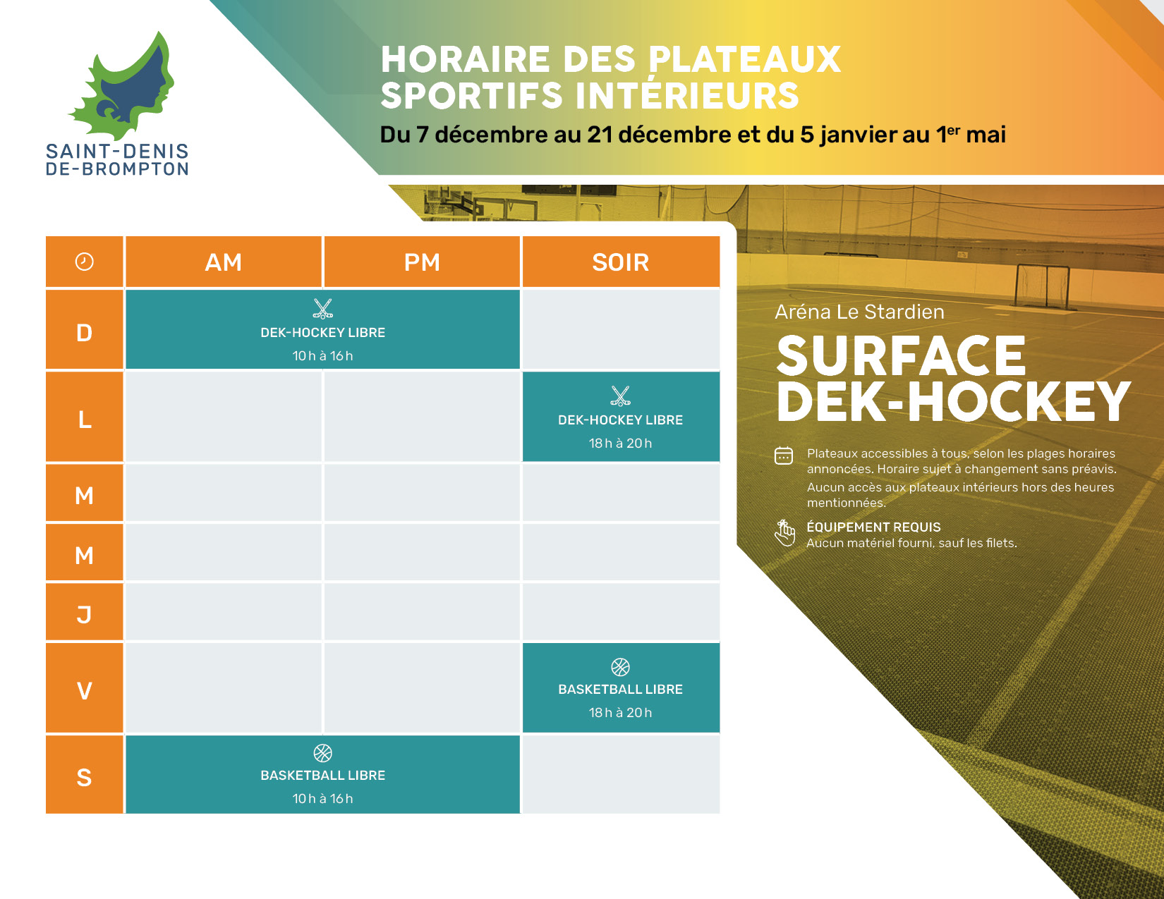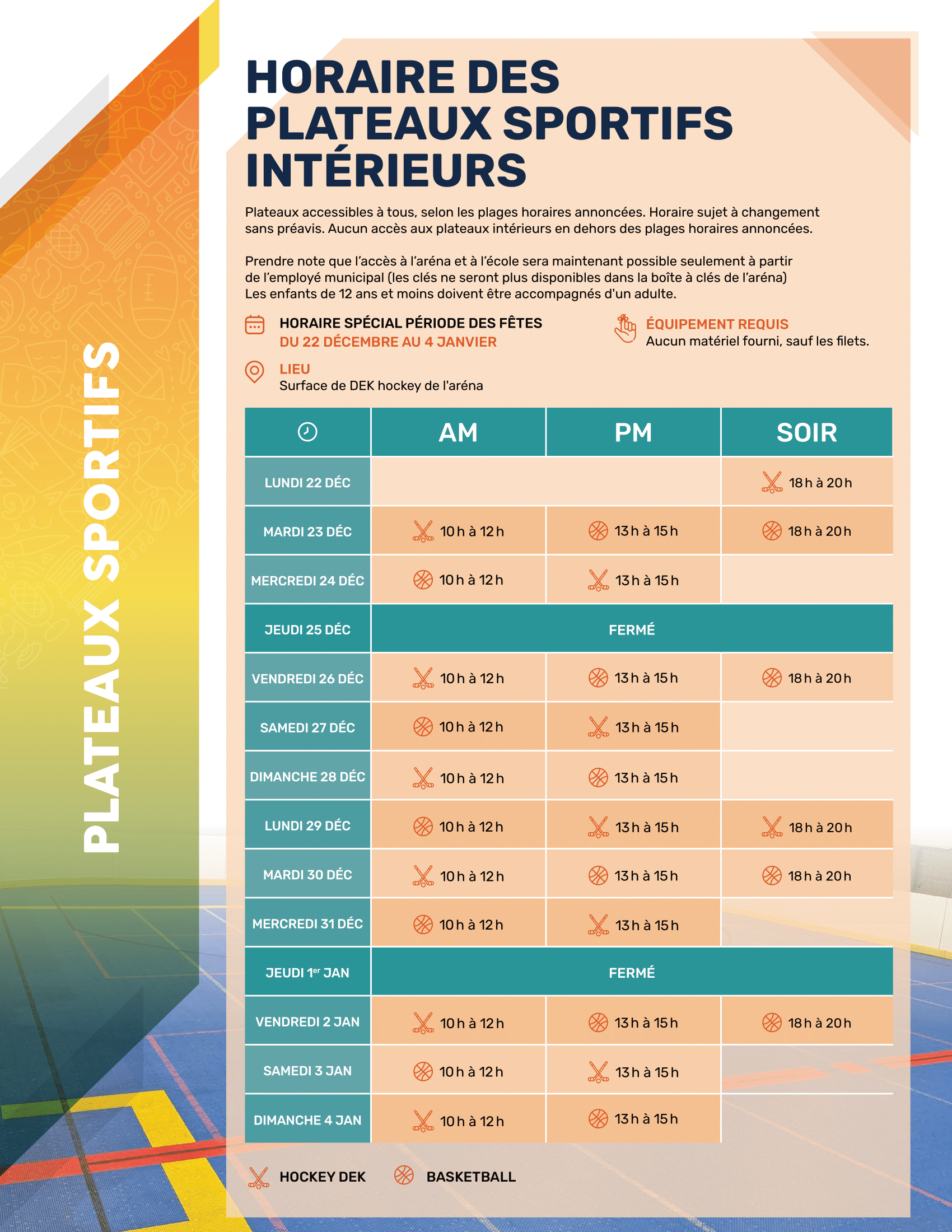 Horaire du temps des fêtes pour la salle le Stardien et la surface de Dek hockey