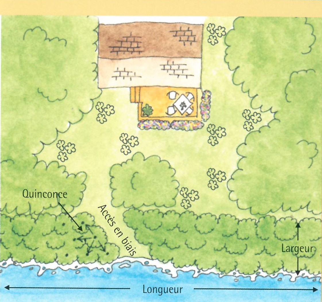 Prévoir une zone végétale de 10 mètres (minimum) en bordure du lac sur toute la longueur de votre bande riveraine.- Vous pouvez aménager une voie d'accès au lac. Celle-ci doit être aménagée en biais (de façon à prévenir l'érosion) et doit se limiter à une ouverture d'un maximum de 5 m de largeur.
