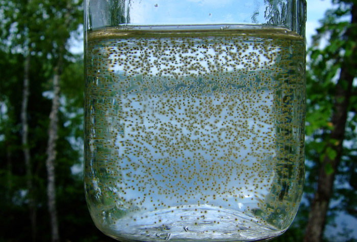 Mettez des gants et prélevez un échantillon avec un pot en verre. Si c'est du pollen, il flottera à la surface. Les cyanobactéries, quant à elles, apparaîtront comme de petites billes dispersées dans toute l'eau du pot. (Voir photo ci-bas, crédit APLB)